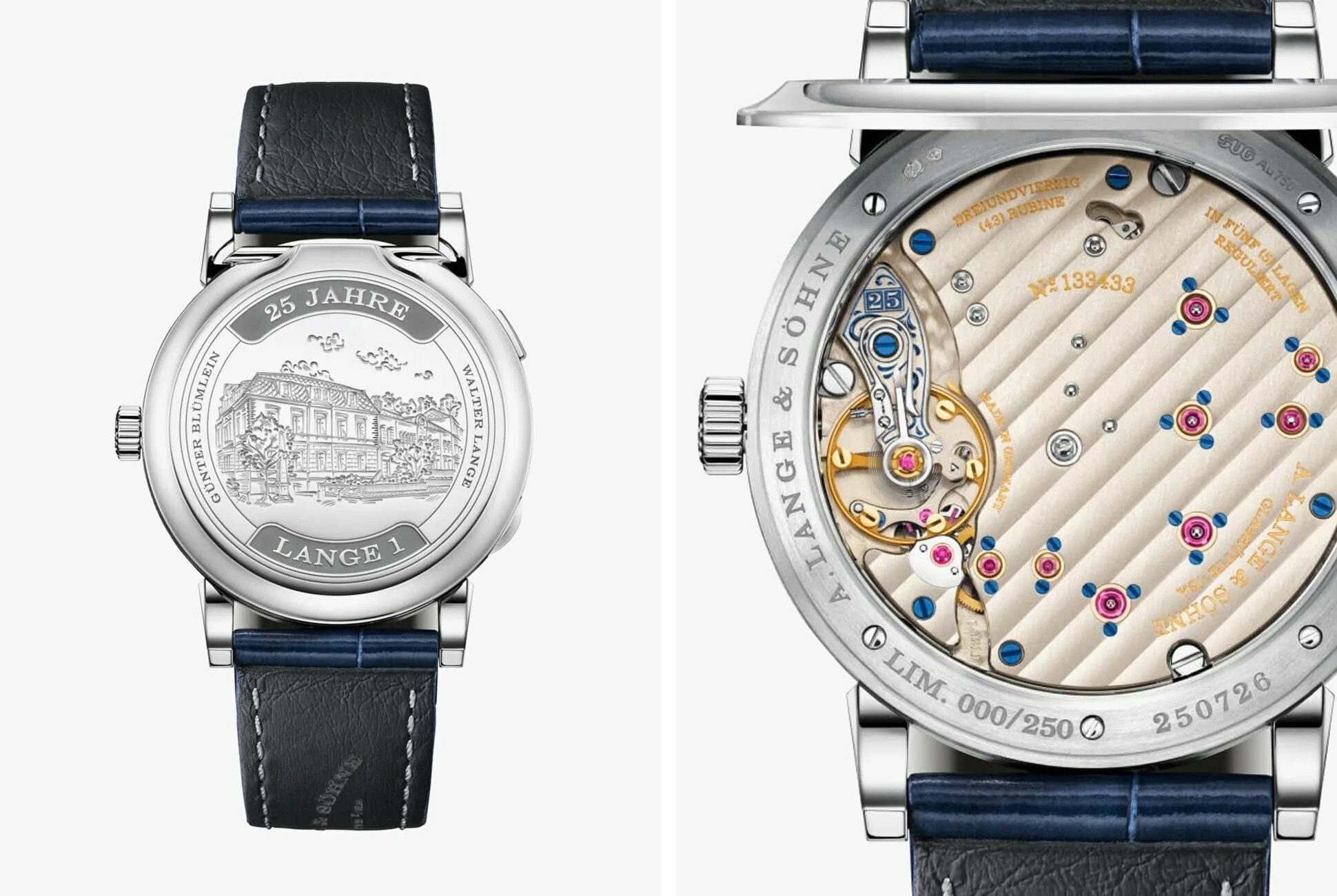 Now, ahead of SIHH 2019 and in time for the 1’s 25th anniversary, Lange has released a new edition of the watch in white gold and limited to 250 pieces (~$49,816). The 25th Anniversary edition features a deep-blue printed argenté dial, blue date numerals, a hinged curvette with an engraving of the manufacturer’s headquarters and a hand-engraved balance cock with blue lines.