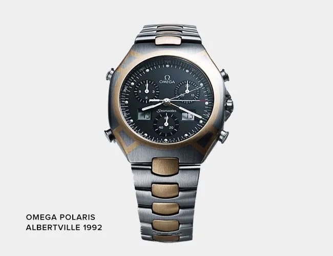 Using the 1992 Albertville Games as a fitting excuse to flex their chronograph muscle, Omega created a special edition of the Seamaster Polaris Multifunction Chronograph. With 499 made for the public and a further 250 made for event sponsors, this advanced quartz chronograph featured 1/10th of a second resolution for measuring standard, split and net timing. Along with its flashy two tone case and bracelet, the Polaris also featured central chronograph seconds and minutes hands which simplified readings for lap and split timing.