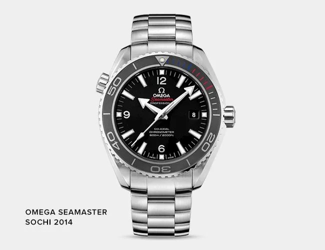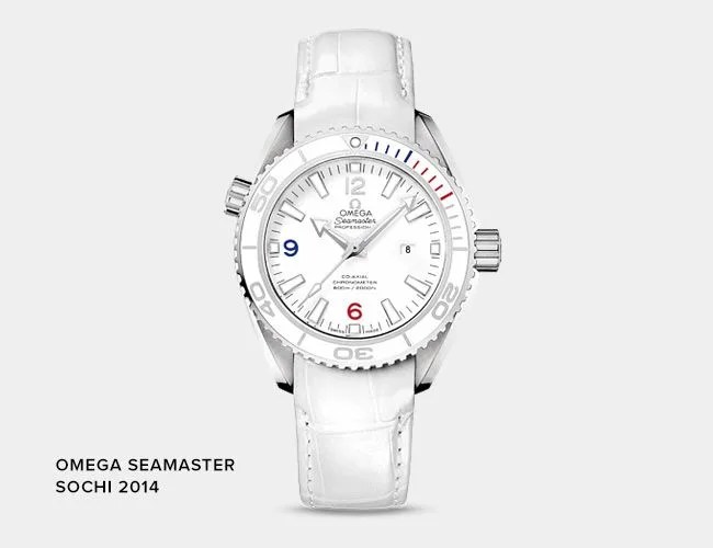 The 2014 Sochi Olympic pieces include two Seamaster Planet Ocean models and a special 18k gold tonneau watch called the Sochi Petrograd. Russian coloring is the name of the game with the Sochi Planet Ocean editions, which are available in 45.5-millimeter and 37.5-millimeter case sizes. The larger version offers a subtle nod to the Sochi games with blue, red and white markings in the fifteen-minute scale on its unidirectional dive bezel. Technologically identical to the standard Planet Ocean, this Sochi limited edition is powered by Omega’s in-house calibre 8500, includes a helium escape valve and is water resistant to 600 meters (2,000 feet). Finished off with a special Sochi 2014 case back, this Winter Games-themed dive watch is limited to 2014 units.