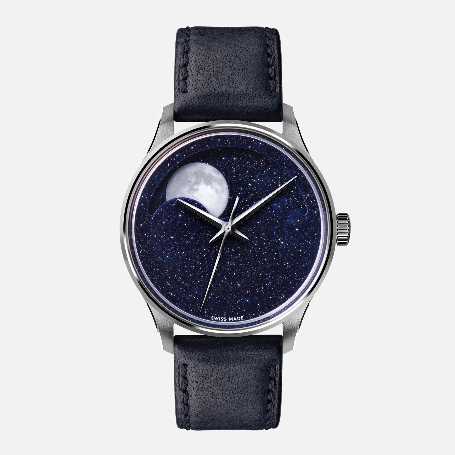 The C1 Moonphase utilizes CW’s in-house JJ04 moonphase module in its purest way yet. There are no indices, no logo, no text on the dial outside of a minuscule “Swiss Made.” It’s just starry skies courtesy of dual layers of aventurine glass and a massive glowing moon (well, two technically, but just one in view at a time) made from Globolight — a mixture of ceramic and Super-LumiNova — that’s been screenprinted with a photo of the actual moon.