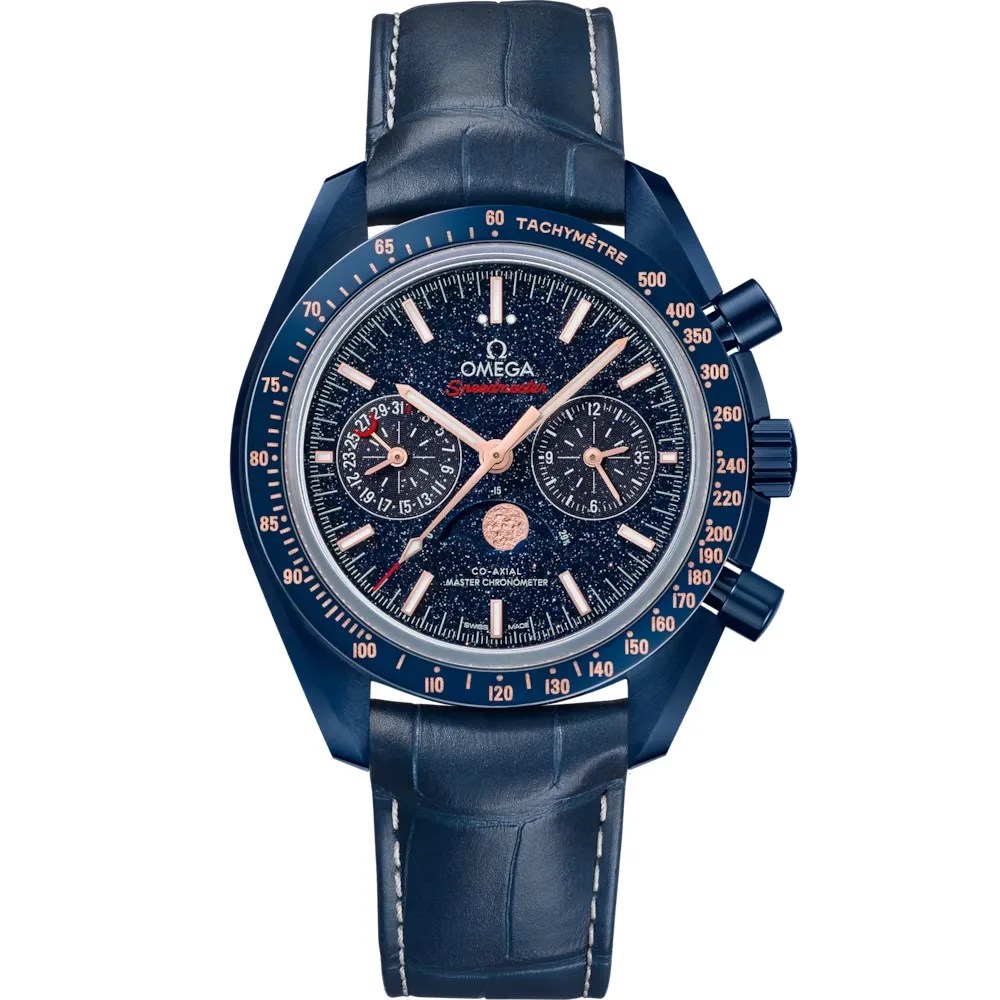 The current take on the form is the Sedna-gold trimmed version of the “Blue Side of the Moon.” Like the Dark Side and Gray Side of the Moon Speedmasters, the Blue Side gets its name from its colored ceramic case. Here, the ceramic seamlessly transitions to the blue aventurine dial, with the Senda gold accents — especially the hammered gold moon on a separate aventurine glass disc — giving the watch even more sparkle.