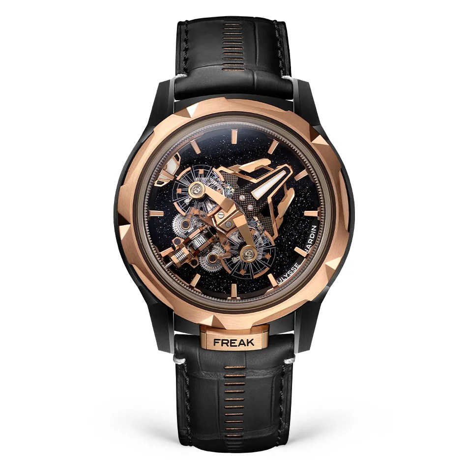 For the Freak S, UN applied black aventurine glass to the mainplate of the movement itself, creating an outer space backdrop for the watch’s otherworldly complication. A big step up from your average Freak, the Freak S’s flying carousel — which resembles a starship — is driven by not one but two escapements, both of which are loaded with silicium parts (the original Freak was the first watch to use silicon parts two decades ago) that have been coated with artificial diamond for durability. And powering it all is an entirely new type of automatic winding system UN calls Grinder that’s twice as efficient as a standard rotor and winds the movement with just the slightest movement of your wrist.